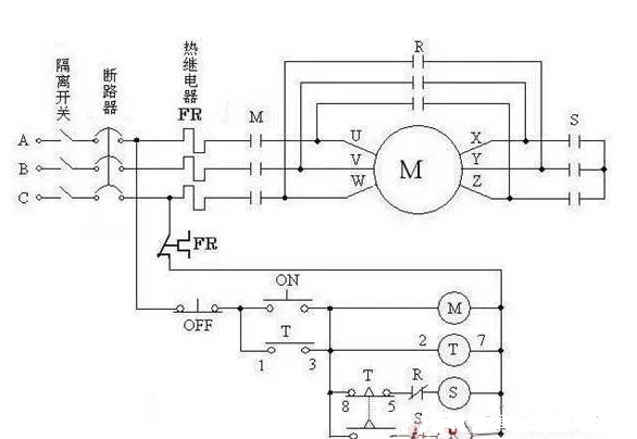 R接觸器,為啟動之后,把電機(jī)繞組首尾連接起來。即U-Z,Y-W,X-V三個繞組的三角形接法。 T時間繼電器,起動時,比如要讓電機(jī)在5秒內(nèi)完成起動進(jìn)入正常運轉(zhuǎn)狀態(tài),就可把時間繼電器設(shè)定到5秒