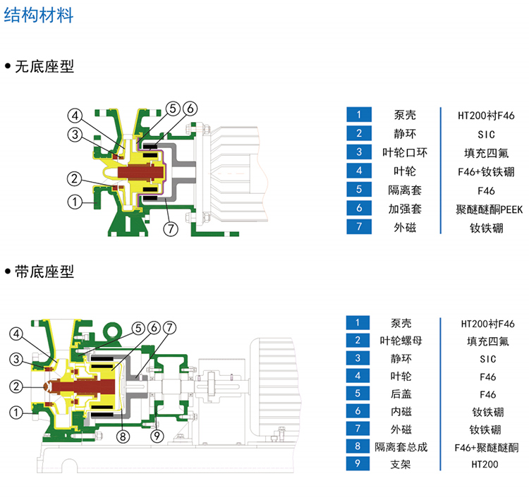 功能上:由于以上的結構設計,材料配置,WJC-F系列耐腐蝕高溫襯氟磁力泵,可輸送含任意濃度的腐蝕性液體、高溫強酸強堿等。我公司氟塑料磁力泵,襯氟磁力泵也是市場上耐酸堿磁力泵和耐腐蝕磁力泵理想優選磁力泵廠家。