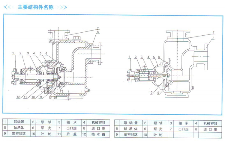 在一些泵的軸承體底部還設(shè)有冷卻室。當(dāng)軸承發(fā)熱引起軸承體溫升超過(guò)70度時(shí),可在冷卻室處通過(guò)任意一只冷卻液管接頭,注人冷卻液循環(huán)冷卻。泵內(nèi)部防止液體 由高壓區(qū)向低壓區(qū)泄漏的密封機(jī)構(gòu)是前后密封環(huán),前密封環(huán)裝在泵體上,后密封環(huán)裝在軸承體上,當(dāng)泵經(jīng)長(zhǎng)期運(yùn)轉(zhuǎn)密封環(huán)磨損到一定程度,并影響到水泵的效率及自 吸性能,應(yīng)給予更換.