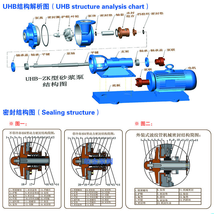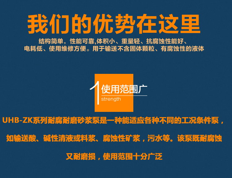 UHB-ZK耐腐耐磨砂漿泵能適應各種不同的工況。如:既可以傳送酸、堿類清液或料漿,也可以輸送冶煉行業各種腐蝕性礦漿,還可以輸送硫酸行業各類稀酸、環保行業的各類污水等。可輸送濃度80%以下的硫酸、50%以下的硝酸、鹽酸等積各類酸、堿、鹽的料漿,稀有金屬冶煉行業的各種腐蝕性砂漿及食品,酒類行業中的各類混合型介質。該泵既耐腐蝕又耐磨損,使用范圍十分廣泛。