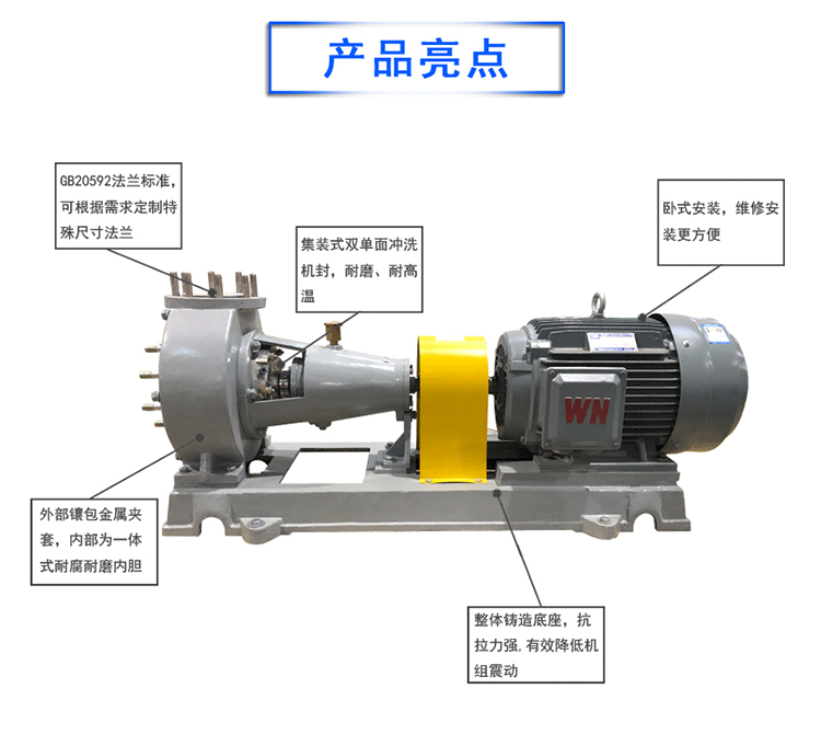 可根據(jù)客戶需要配置相應(yīng)的沖洗方案,廣泛應(yīng)用于酸洗,環(huán)保脫硫,脫硝,化工,造紙,染料污水處理等領(lǐng)域。改泵運(yùn)行穩(wěn)定,抗汽蝕性能強(qiáng),特別合適含有顆粒雜質(zhì)的酸堿性有腐蝕介質(zhì)。具有高效節(jié)能,噪音振動(dòng)低,可靠性高,壽命長(zhǎng),品質(zhì)好、且價(jià)格公道合理等優(yōu)點(diǎn),是化工,酸洗,環(huán)保,脫硫,污水處理的理想輸出設(shè)備。
